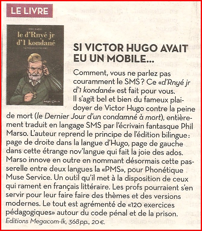 REVUE DE PRESSE « le d'Rnyé jr d'1 kondané Victor Hugo vo PMS » de Phil Marso Victor Hugo traduit en langage SMS / PMS !!! |